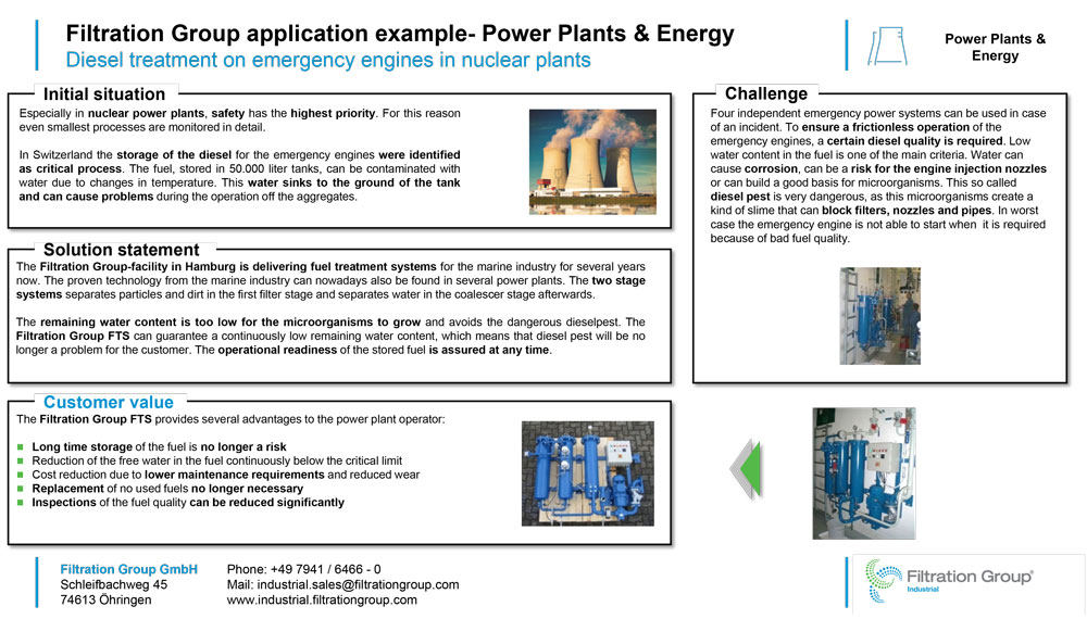 Il sistema FTS di Filtration Group, solitamente impiegato nel settore marino, è sempre più implementato anche in centrali elettriche. Esso è dotato di due stadi in serie che consentono la filtrazione di particelle e sporco e la separazione attraverso membrane a coalescenza. Il contenuto di acqua viene mantenuto basso, così il combustibile può essere utilizzato in qualsiasi momento.