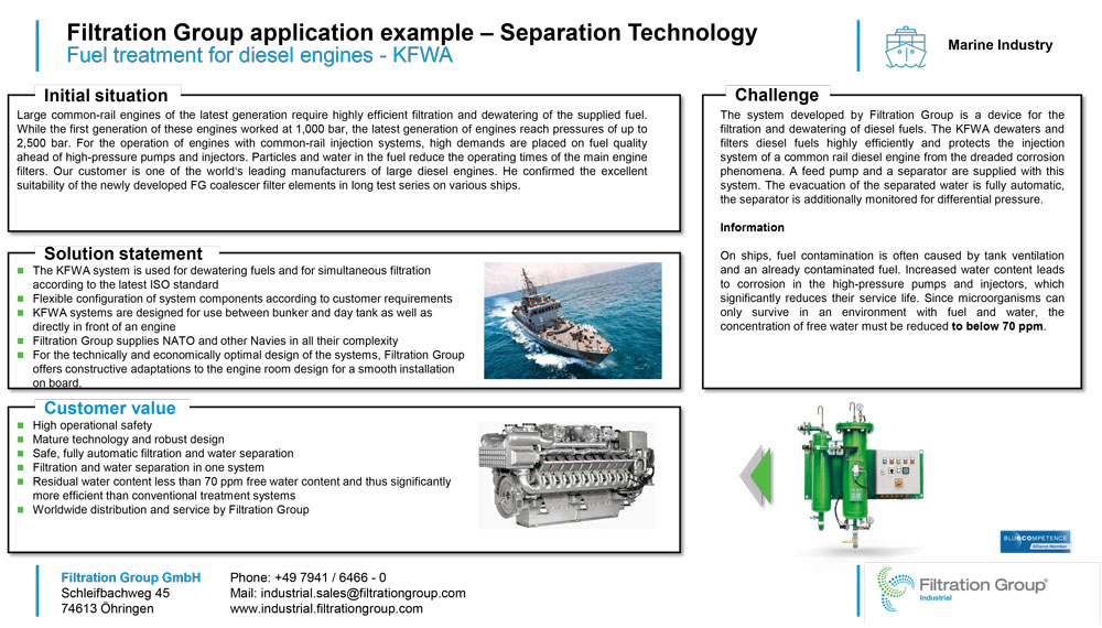 I grandi motori common-rail di ultima generazione, con pressioni operative che raggiungono i 2.500 bar, richiedono una filtrazione altamente efficiente e la disidratazione del carburante fornito. L’acqua e le particelle in sospensione, infatti, riducono i tempi di utilizzo dei filtri principali del motore, delle pompe ad alta pressione e degli iniettori, e possono portare nel medio-lungo periodo a fenomeni importanti, come ad esempio corrosione di alcuni componenti o sviluppo di microrganismi. Filtration Group ha sviluppato una tecnologia che, combinando l’azione di un filtro tradizionale e di speciali membrane a coalescenza in un unico elemento, permette di ridurre drasticamente il contenuto di contaminanti e di acqua libera, da 1.000 a 70 ppm. Il sistema può essere implementato in linea davanti al motore (versione MAIN), oppure sul serbatoio (versione BY).