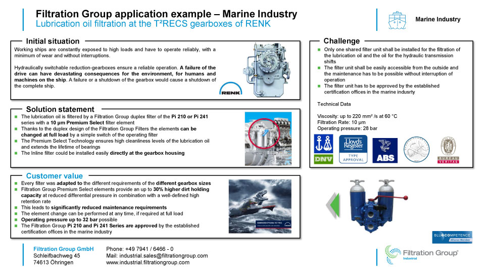 The Filtration Group Pi 210 series are approved by certification bodies in the nautical sector.