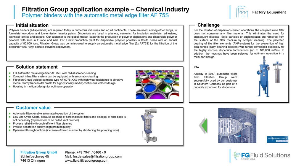 Il seguente studio riguarda la filtrazione del copolimero EVA (etilene vinil acetato) per la produzione di leganti polimerici per vernici, materiali isolanti, adesivi, ecc… La soluzione di Filtration Group consiste nell’installazione di un filtro automatico AF 75 S a lama metallica; gli elementi filtranti utilizzati AF 6076 prevedono una struttura a profili triangolari saldati che ne incrementa la resistenza all’usura durante la filtrazione di fluidi ad elevata viscosità (fino a 100000 mPa∙s).